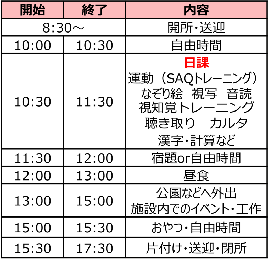 「学習の集中力をつける」「より良い目の使い方ができるようになる」「コミュニケーションをさらにスムーズにする」などの、狙いを持って「療育運動、集団遊び」をした後に学習する、という1日の流れです。